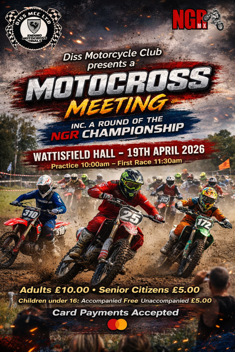 Diss MCC will be holding their very popular evening motocross race meeting at the Wattisfield Hall venue on Wednesday evening 10th July – first race 6pm. Expect the event to attract a large crowd as it consists of short sharp all action races. A big thanks to GH Motorcycles and GB Finch who have continued their support of the meeting so please check out the GH Motorcycles stand as Gavin Hockey has some great offers on hand.